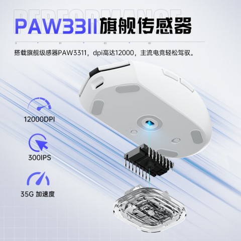 Размеры мыши составляют 116,8 x 63,8 x 37,9 мм, вес — 85 граммов. Её основой стал оптический сенсор PAW3311 со скоростью отслеживания 300 ips и ускорением 35 G. С помощью специальной кнопки, расположенной под колесом прокрутки, можно быстро переключаться между шестью пресетами: 800, 1200, 1600, 3200, 5000 и 12 000 dpi.