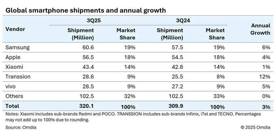 Аналитики компании Omdia опубликовали свежий отчёт о ситуации на мировом рынке смартфонов по итогам 3 квартала 2025 года. Составленный ими рейтинг отобразил не только рыночные доли крупнейших брендов смартфонов, но и динамику относительно прошлогодних показателей.
