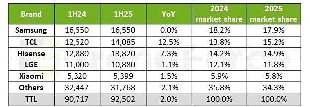 Лидеры — Samsung, TCL, Hisense, LG Electronics и Xiaomi — удерживают 65,6% мирового рынка. Samsung сохранил прошлогодние объёмы, тогда как TCL увеличила поставки на 12,5%, Hisense — на 7,3%, а Xiaomi показала рост на 1,5%. LG, напротив, сократила поставки на 1,1%. TCL и Hisense выиграли за счёт выгодных китайских субсидий и высокого спроса на международных рынках, что укрепило их позиции.