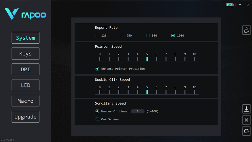 На основной вкладке «System» можно задать базовые параметры мышки: частота опроса сенсора; скорость указателя; скорости дабл клика и скролла.