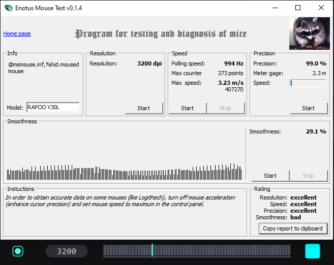 Одна из самых популярных программ Enotus Mouse Test выдала неплохие результаты. Для обзора были выставлены средние значения: 3200 DPI и 1000 Hz.
