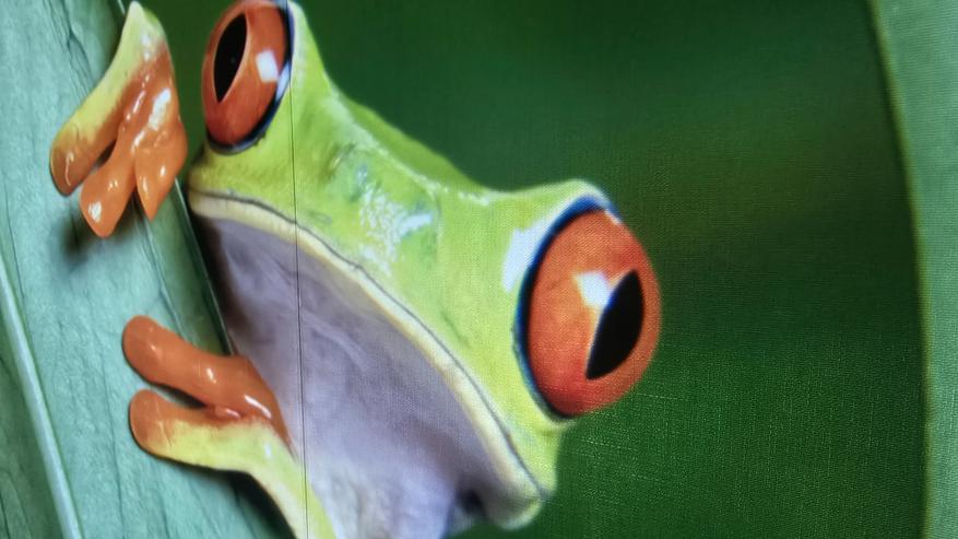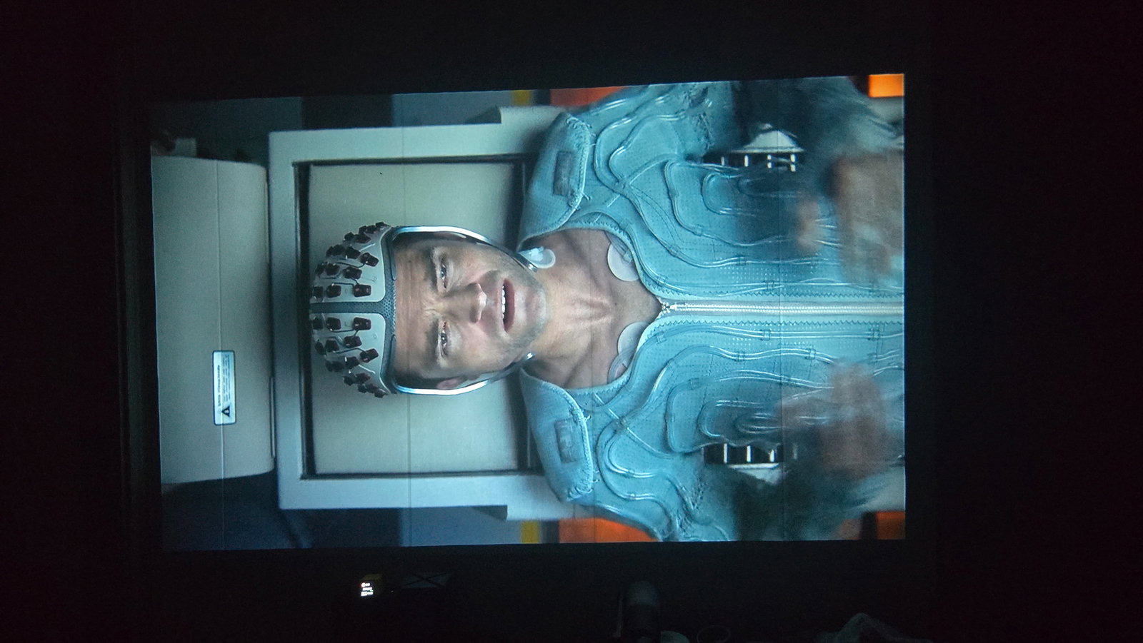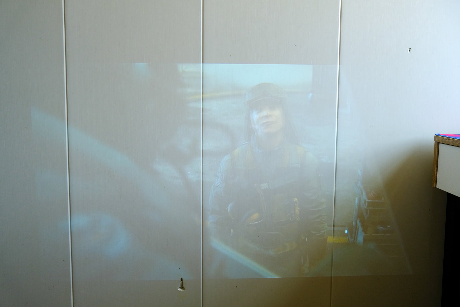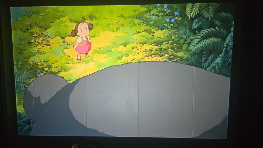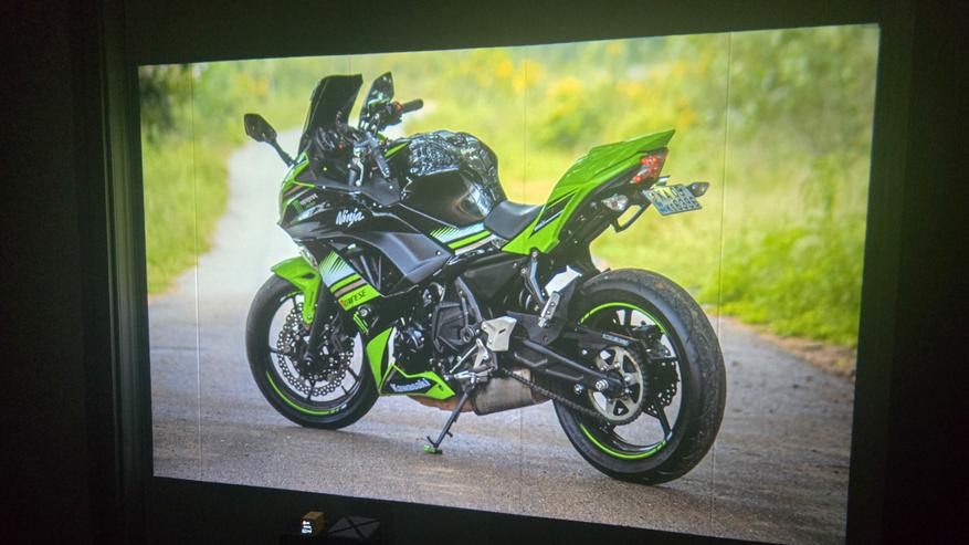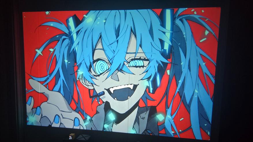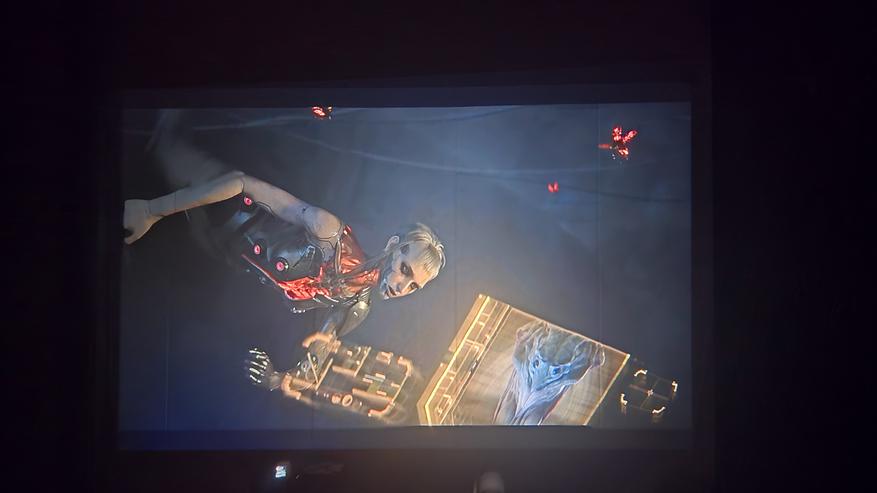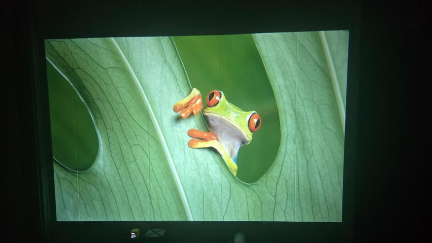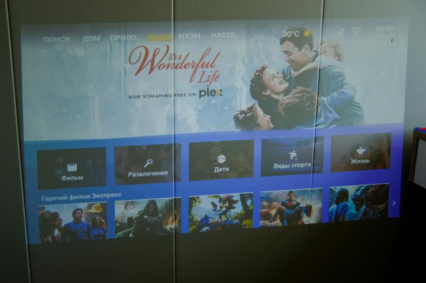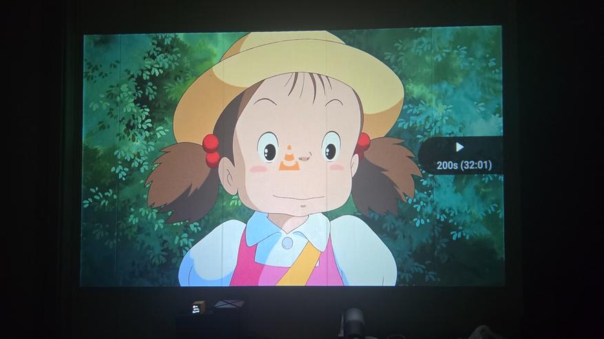Как можно заметить, экран для проектора я не использую. Изображение у меня просто на стене, покрытой бежевыми пвх панелями. Меня это устраивает, с учётом того что качество изображения достаточно хорошее, проектор спокойно показывает даже на такой не совсем подходящей поверхности. А при приближении камеры можно увидеть только структуру панелей, а не сетку картинки. Также нет проблем и с текстом. На фото выше видно. Всё читается чётко. Если же картинка прям мега яркая и сочная, то она выглядит практически как на экране телевизора. Вот пример ниже.