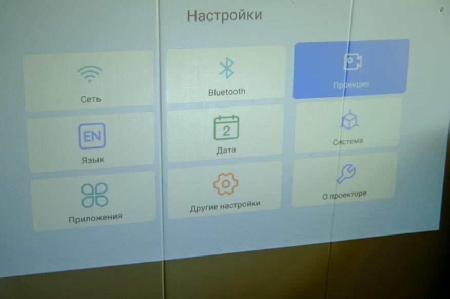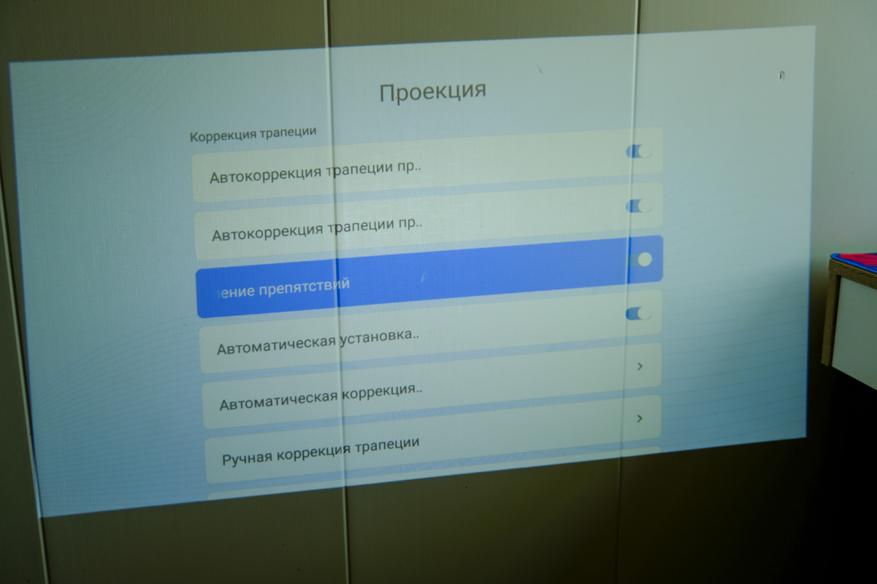 Кстати, количество настроек у проектора не очень большое, но всё что касается фокуса, трапеции, поворота экрана и т. д. имеется. Есть даже функция автоматического поиска препятствий. В этом случае проектор проверяет целостность картинки, и если что-то не так, подгоняет картинку под такой размер, когда ничего не находится в зоне изображения. Например, если вы проецируете на стену, где есть выключатель, проектор сам обнаружит его и сделает картинку меньше, оставив выключатель за зоной изображения.