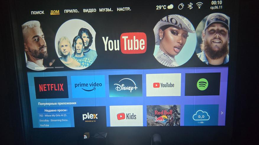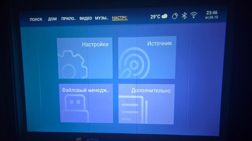 Проектор работает на Android версии 9, с установленным лаунчером от Lenovo. Называется этот лаунчер ZUI. В целом слегка похож на интерфейс ATV и сделан так, чтобы можно было комфортно управлять обычным пультом.