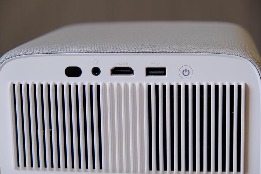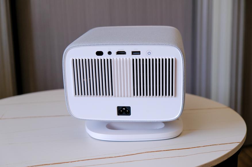 Сзади у проектора находятся вентиляционные решетки из которых выходит воздух от системы охлаждения. Снизу разъём для подключения питания. А над решетками глазок для ИК приёмника, разъём AUX, разъём HDMI, порт USB A для подключения флэшек и внешних жестких дисков. и кнопка питания.