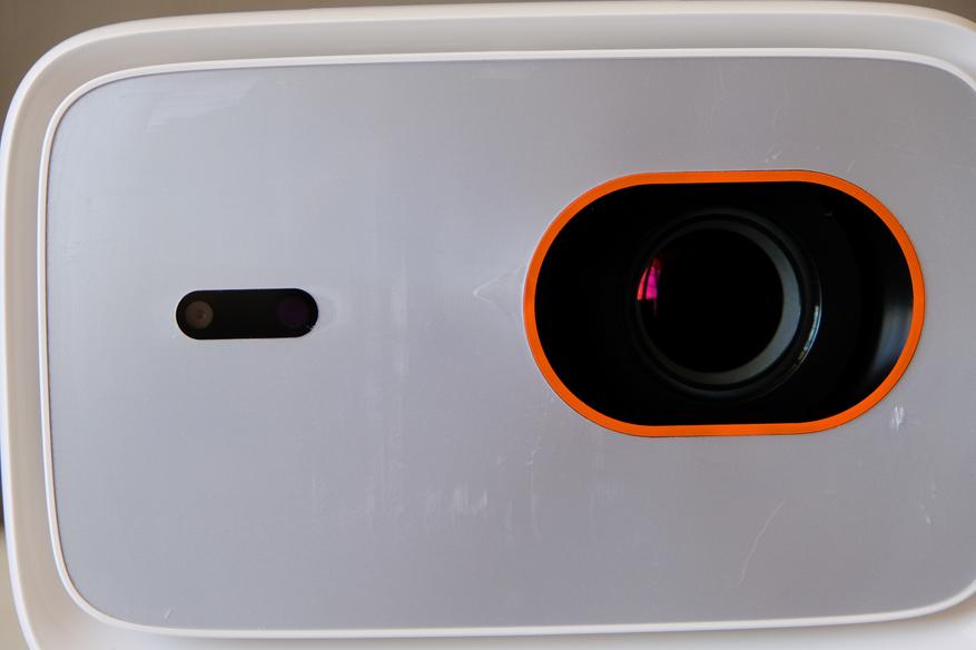 В остальном же перед нами привычный в своём понимании проектор. Коробка, обтянутая тканью (для защиты от пыли и лучшего внешнего вида). Спереди проекционная линза, закрытая плексигласом, чтобы не покрывалась пылью, а слева от линзы находится камера и датчик определяющие чёткость картинки и делающие магию под названием автоматическая фокусировка.