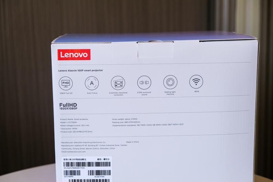 Проектор Lenovo Xiaoxin 100P поставляется в среднего размера коробке, с указанием, что внутри, техническими характеристиками и в фирменном дизайне производителя