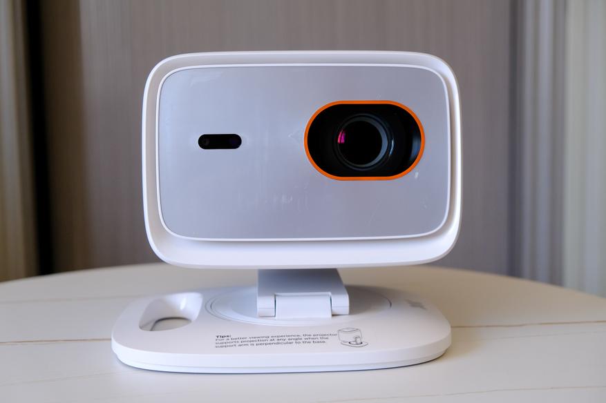 Что касается уже упомянутой ножки, то она позволяет поворачивать проектор в любые стороны, крутить его, как угодно, задирать линзу вверх, вплоть до просмотра видео на потолке и, если надо, регулировать высоту подъёма. Ну очень удобно, и намного удобнее чем у проекторов без ножки, которые при размещении иногда приходится размещать на разные коробки и подставки, чтобы поймать нужный угол в нужной точке стены.