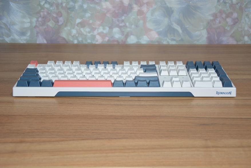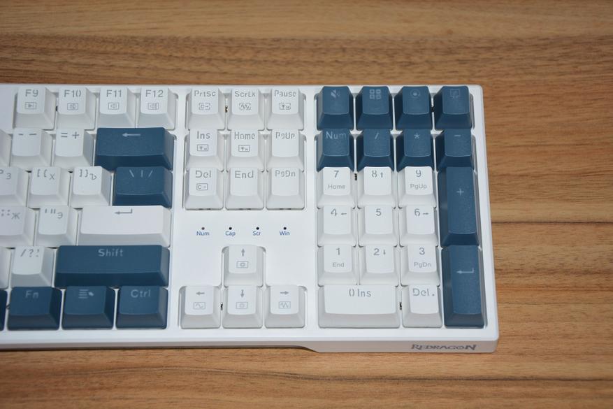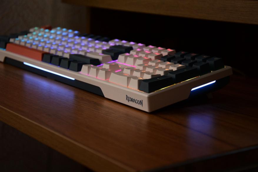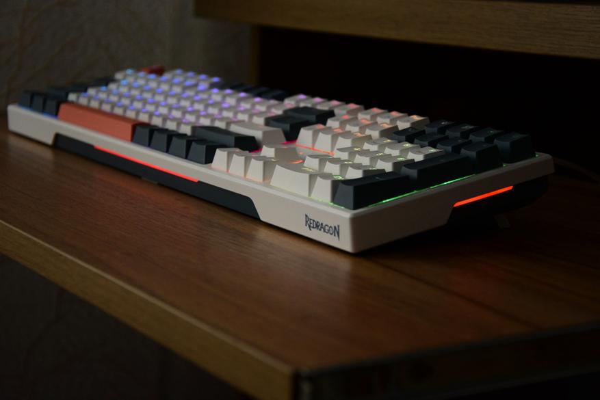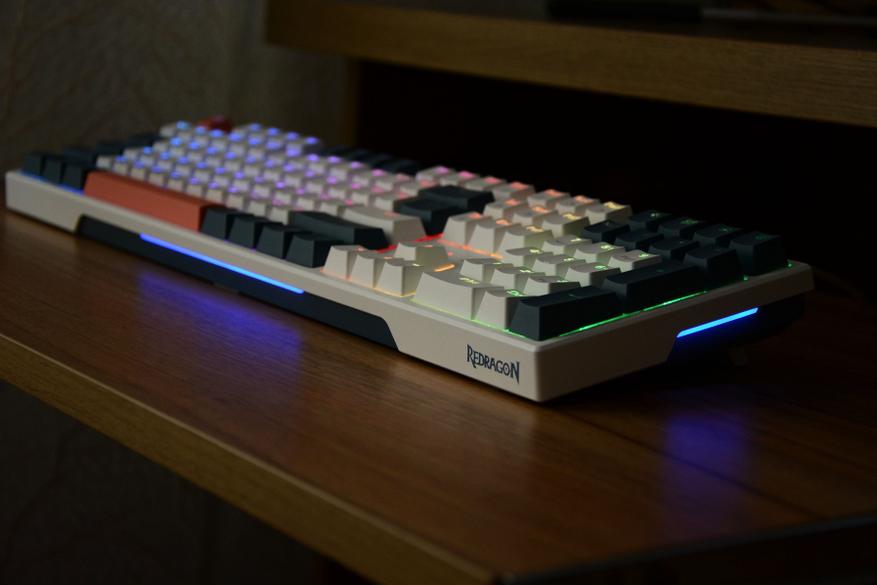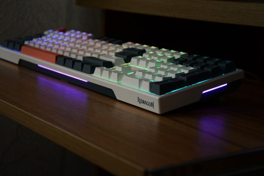 Такие же светофильтры установлены по бокам клавиатуры. Корпус видимо делается с прицелом на еще одну модель — слева размечено место под USB разъем. От классических канонов эргономики инженеры Redragon отступать не решились, и в нижней и верхней части клавиши немного выше средних, что на практике очень удобно. Все колпачки клавиш, кроме пробела, имеют вогнутую поверхность, пробел выпуклую.