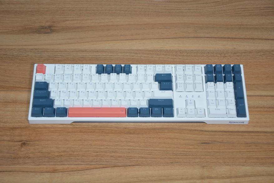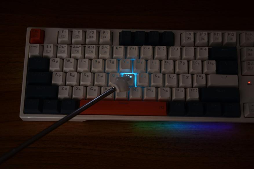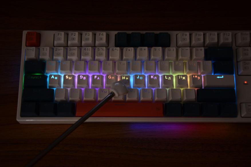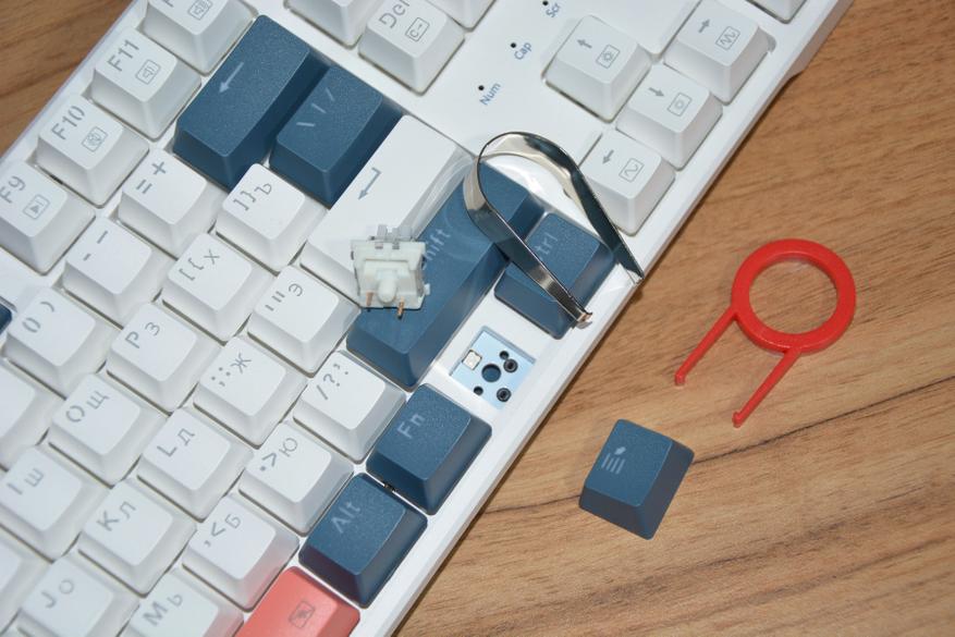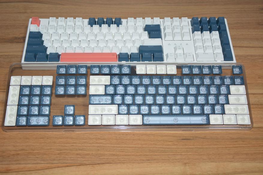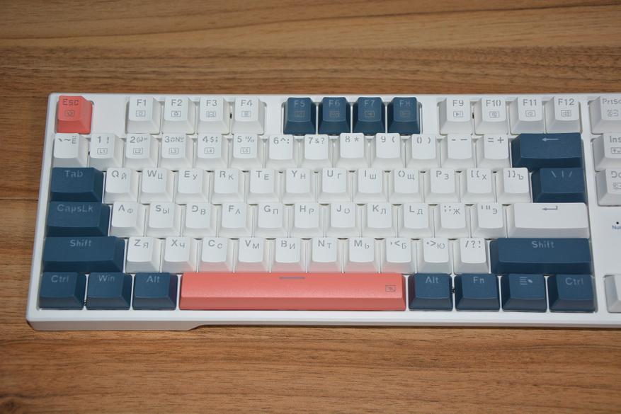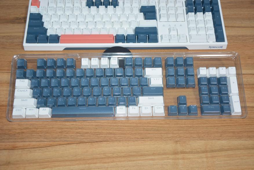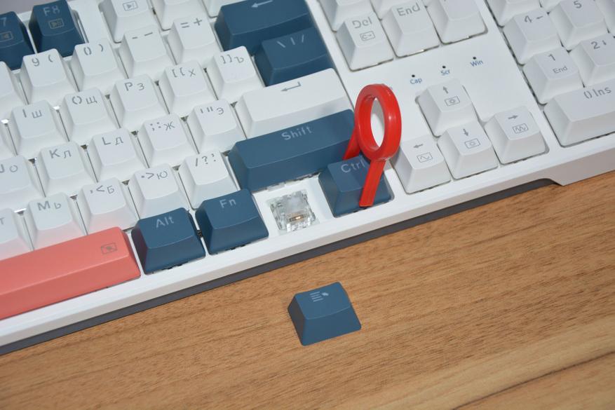 Если не нравится заводская, трехцветная комбинация клавиш, то в комплекте идет набор колпачков из 104 штук. Теперь можно сделать бело-терракотовую расцветку или серо-терракотовую, бело-синим или синим весь верхний ряд, или бело-синию через клавишу. В общем кастомизировать на свое усмотрение.