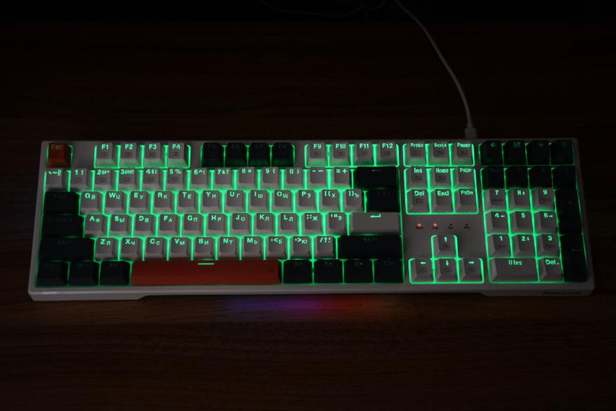 Если не нравятся разноцветные, динамичные режимы, то можно подсветку сделать статичной, одного цвета. Например, для работы вечером остановился на зеленой, днем удобно пользоваться белой или желтой. Эти режимы выбираются комбинацией Fn+Del.