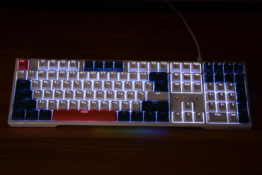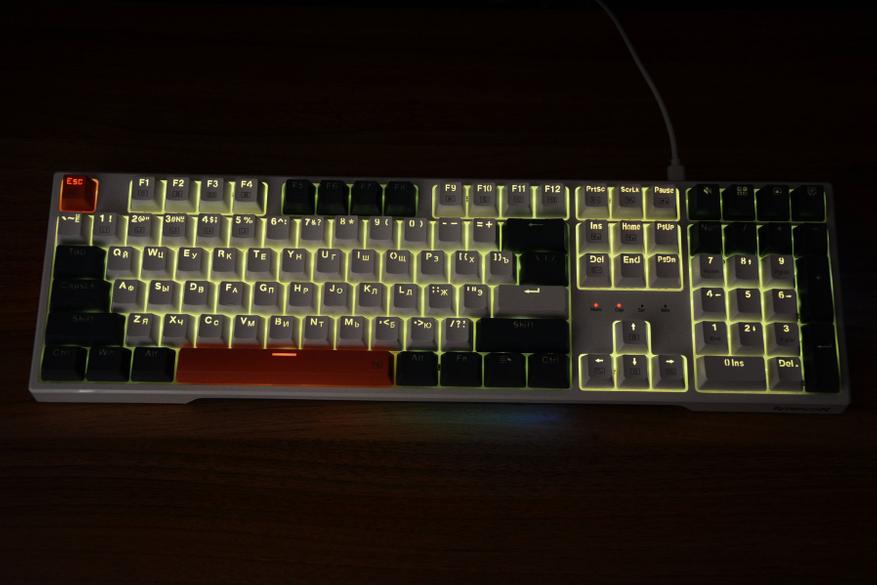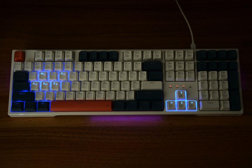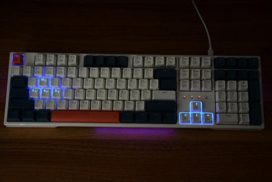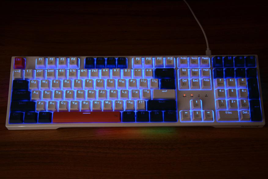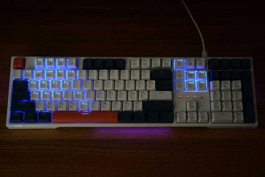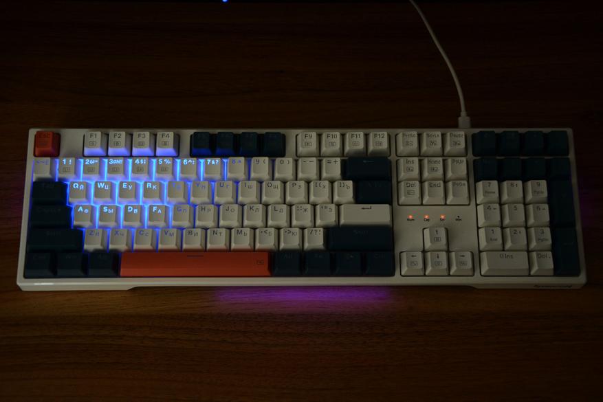 На коробке клавиатура изображена в базовом языковом варианте и может сложиться первое впечатление о необходимости русификации. Но на практике все в порядке — нужные нам символы присутствуют и ни наклейки, ни гравировка не потребуется. Размеры клавиатуры 44 на 13 см, набор клавиш состоят из трех блоков с тремя вариантами расцветки. Сочетание белых, синих (сине-серых) и оранжевых клавиш делает клавиатуру наряднее, лишает унылости и в целом такая подойдет как для работы, так и конечно же для игр. Раскладка ANSI, клавиша F1 над клавишей 2, два широких шифта и так называемый одноэтажный Enter. Словом, классика. Над цифровым блоком установили четыре дополнительных клавиши.