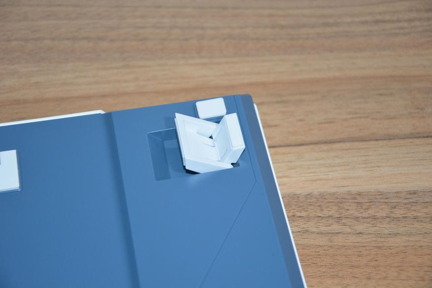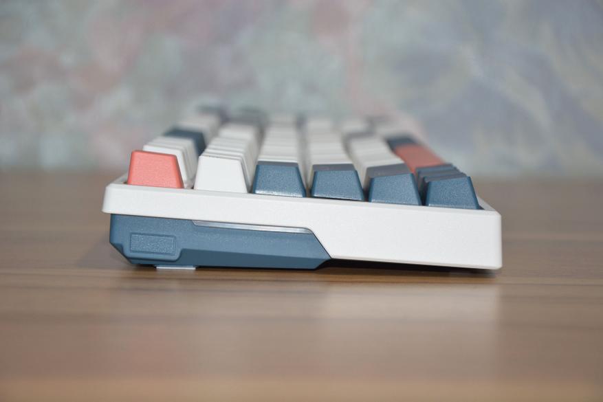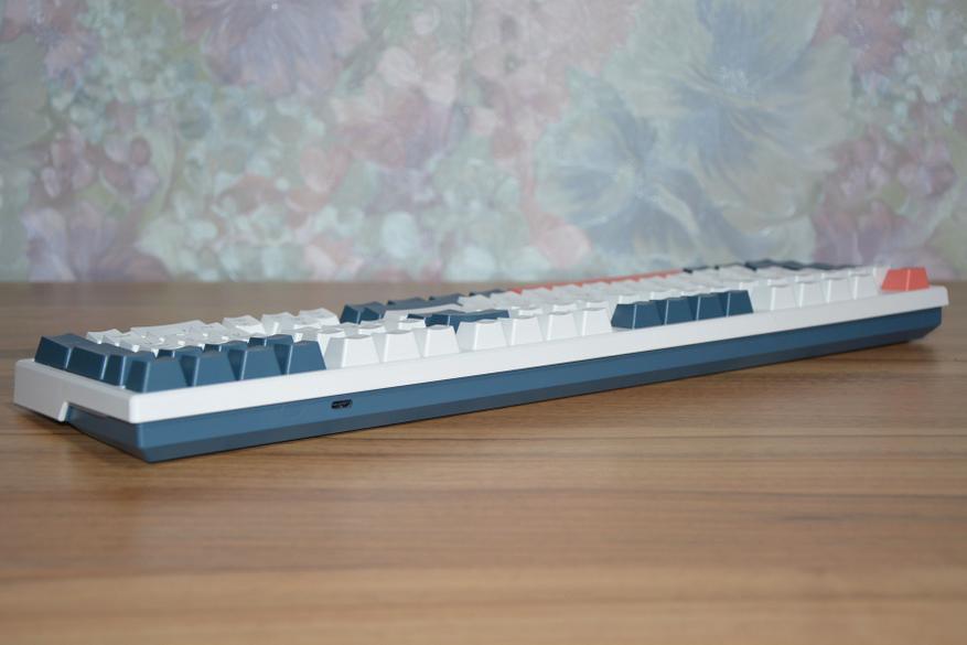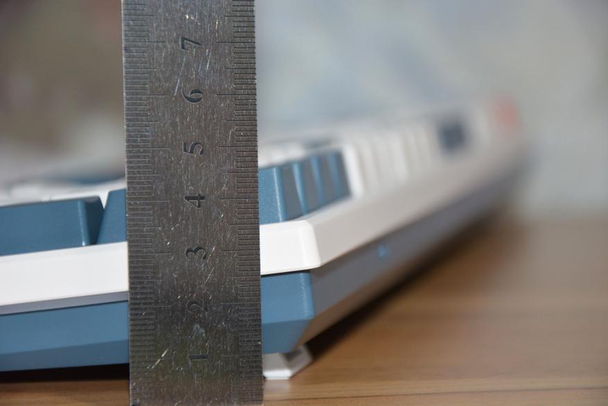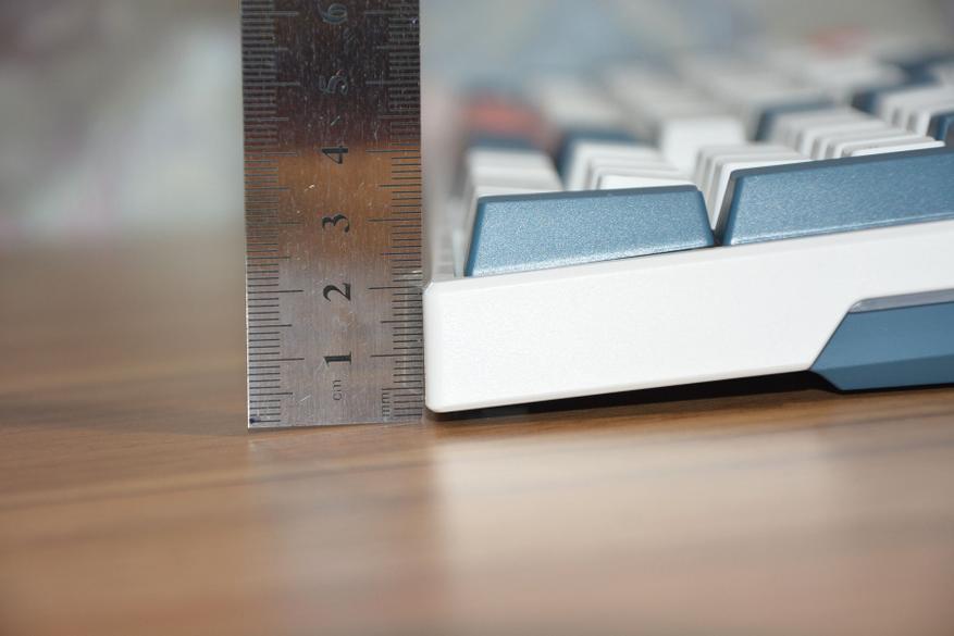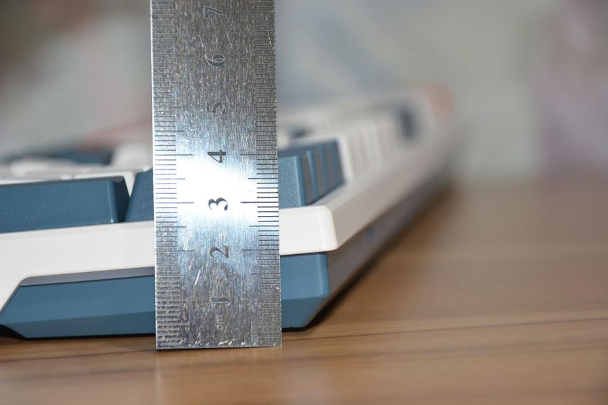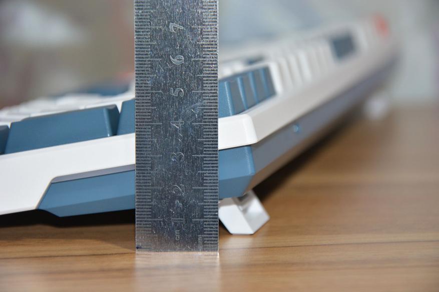 Шероховатость клавиш и корпуса хорошо видна на фото ниже, а на практике пальцы не скользят по клавишам, клавиатура не выскальзывает из рук. Поскольку клавиатура механическая, то и высота ее соответствующая — 3,3 см в передней и 4 см в дальней части корпуса. Маленькие ножки добавляют в дальней части еще 6 мм, а большие поднимают на высоту 5,3 см.