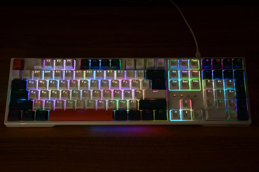 Боковая подсветка работает автономно от подсветки клавиш. Здесь четыре режима работы (FN+Pause) — RGB, неон, один цвет и дыхание. В статическом режиме 7 цветов, в динамических пять уровней скорости (Fn+Scrlk).