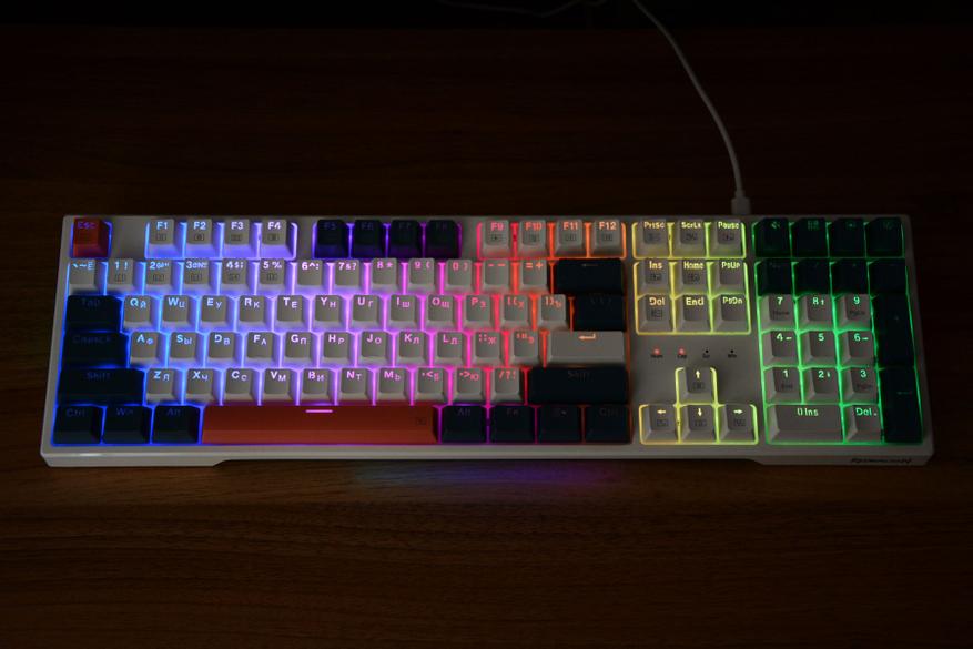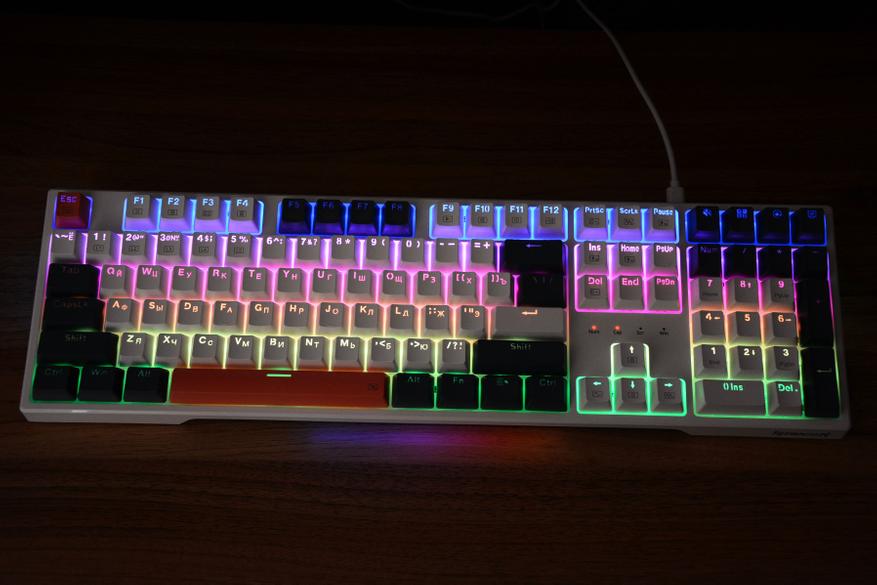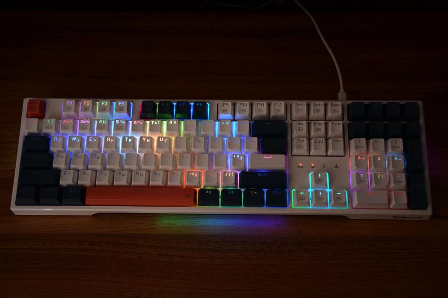 В итоге, Redragon Whisper без преувеличения является интересной клавиатурой. Сочетание цветового оформления и множество вариантов основной и боковой подсветки лишает ее скучности, а тихие свитчи шума. Клавиатура поддерживает горячую замену свитчей, а значит есть место для маневра по кастомизации. Возможно отсутствие ПО несколько сужает возможности по переназначению клавиш и задания макросов, но есть возможность выделить подсветкой нужные клавиши в конкретной игре. При этом клавиатура универсальна, подойдет как для игр, в том числе ночью, так и для тихой работы дома или офисе. Ну, и нельзя забывать про набор мультимедийных опций, быстрый вызов калькулятора, сворачивание всех окон, полное отключение звука и съемный кабель, который всегда можно заменить.