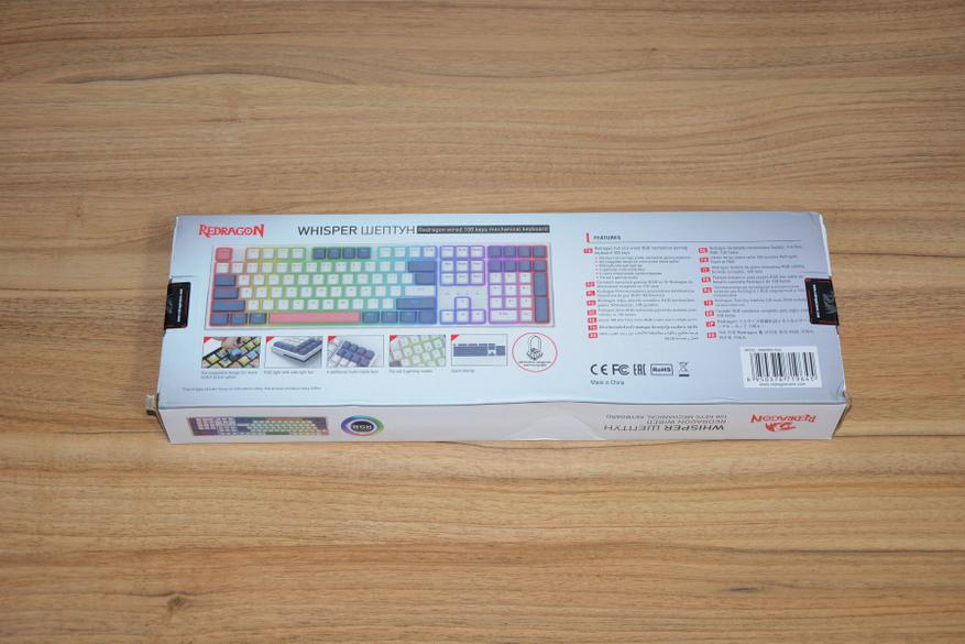 Коммерческая упаковка слегка пострадала во время доставки, но содержимое защитила и не утратила наглядность. Общий вид клавиатуры, пояснения и изображения отдельных элементов дают максимум представления о клавиатуре, а именно: 108 клавиш, подсветка, механические белые, а значит тихие, свитчи. На нижней стороне иллюстрация о замене клавиш и свитчей. Кроме того указаны особенности, вроде поддерживаемой горячей замене свитчей, игровых режимах, мультимедийных функциях. Коробка опломбирована с двух сторон, что подтверждает невмешательство во внутренний мир упаковки и содержимого.