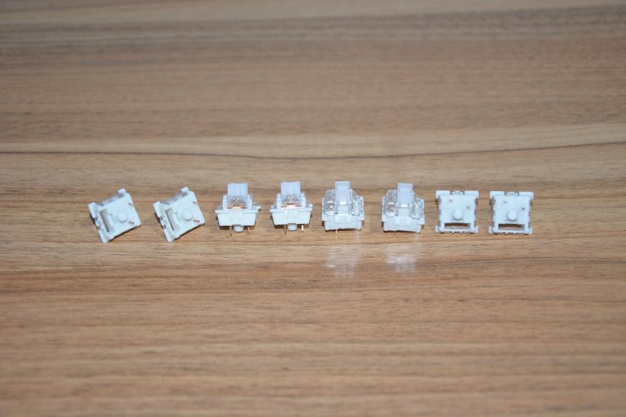 Свитчи частично выполнены из прозрачного пластика и можно без труда рассмотреть их внутренности. Кроме того несложно заметить, что все контакты сделаны из меди. Магнит отсутствие железа, покрытого медью, подтвердил. Свитчи смазаны с завода. После разборки одного из них на пальцах остался налет смазки.