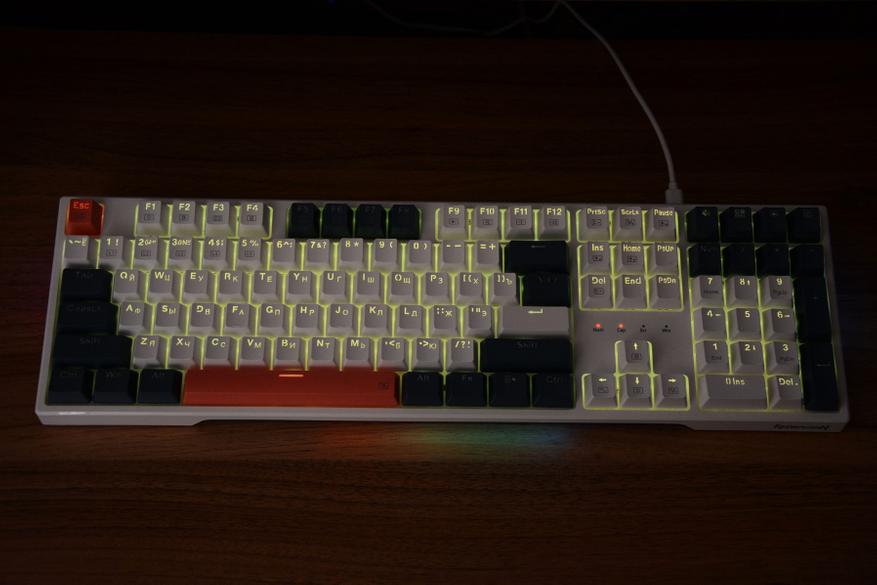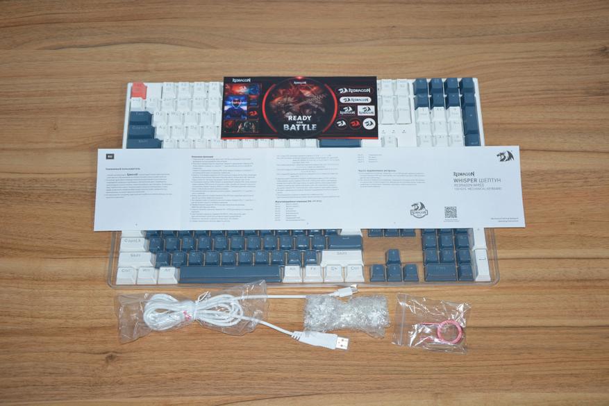Whisper или Шептун, именно такая проводная модель клавиатуры на 108 клавиш появилась у Redragon. Теперь можно работать в полной темноте или играть, когда все спят. Ведь все клавиши подсвечиваются, а собрана клавиатура на белых, тихих свитчах. Есть второй комплект кейкапов и запасные свитчи.