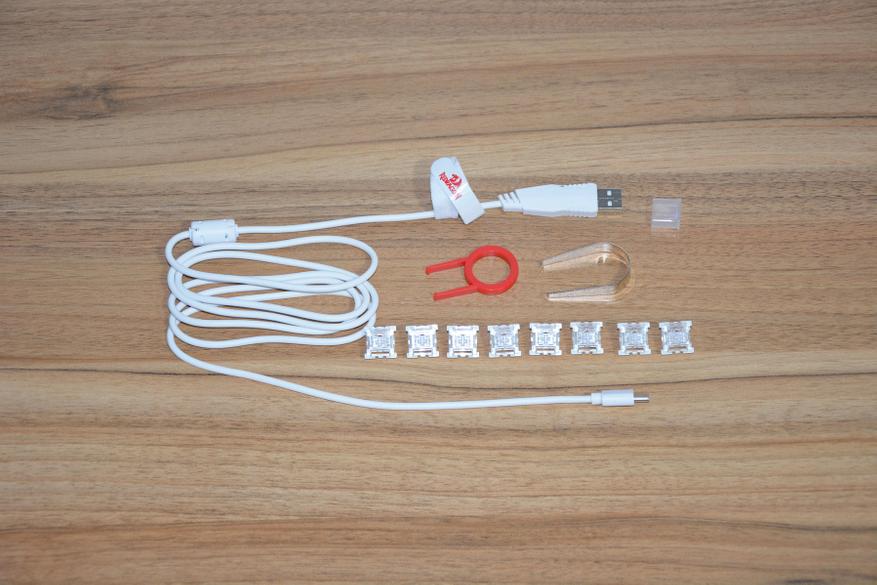 Кабель длиной полтора метра у коннектора USB-A снабжен фильтром и стяжкой для излишков провода. Если такая длина кабеля окажется не оптимальной, то кабель всегда можно заменить на более длинный или короткий. Экстрактор колпачков клавиш сделан из пластика красного цвета, а свитчей металлический. Отдельную благодарность стоит выразить за запасные свитчи собственного производства Redragon, так как у азартных геймеров любые свитчи порой выходят из строя. Запасных положили восемь штук.