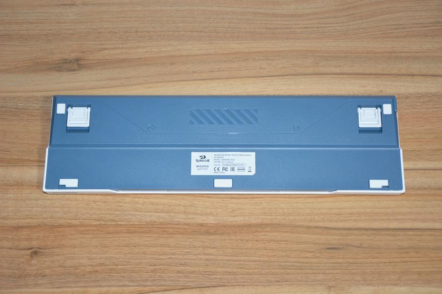 Нижняя часть корпуса также рельефная, в нижней части установили три противоскользящих ножки, сверху две. Наклейка в центре уточняет наименование модели — R668WBO-RGB. Удобно сделаны откидные ножки — они двухуровневые. Одна вложена в другую и имеют легкую фиксацию. В зависимости от личных предпочтений можно сложить ножки вовсе или отрегулировать подъем по высоте. Весит клавиатура почти 1 кг, и вкупе с противоскользящими ножками сдвинуть ее просто так не получится, тут нужны ощутимые усилия.